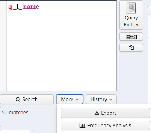 Чтобы выполнить частотный анализ, введите запрос в поле AQL как обычно. Обратите внимание, что запускать сам поиск предварительно не требуется. Затем откройте меню "More" между кнопками "Search" и "History" и выберите "Frequency Analysis".