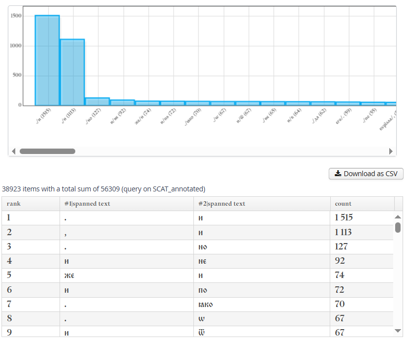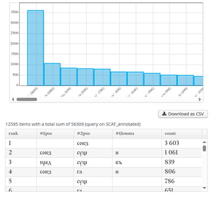 При нажатии на "Perform frequency analysis" будет получено распределение всех биграмм соседних токенов в корпусе. График отображает только первые 500 элементов, однако таблица под ним содержит полный список значений, который также можно экспортировать в формате CSV.