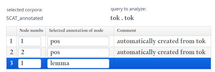Можно заменить строки анализа, в которых учитываются значения tok, на pos, чтобы получить биграммы частей речи. Также можно добавить аннотацию lemma для первого элемента поиска, нажав кнопку Add и указав номер узла и имя аннотации.